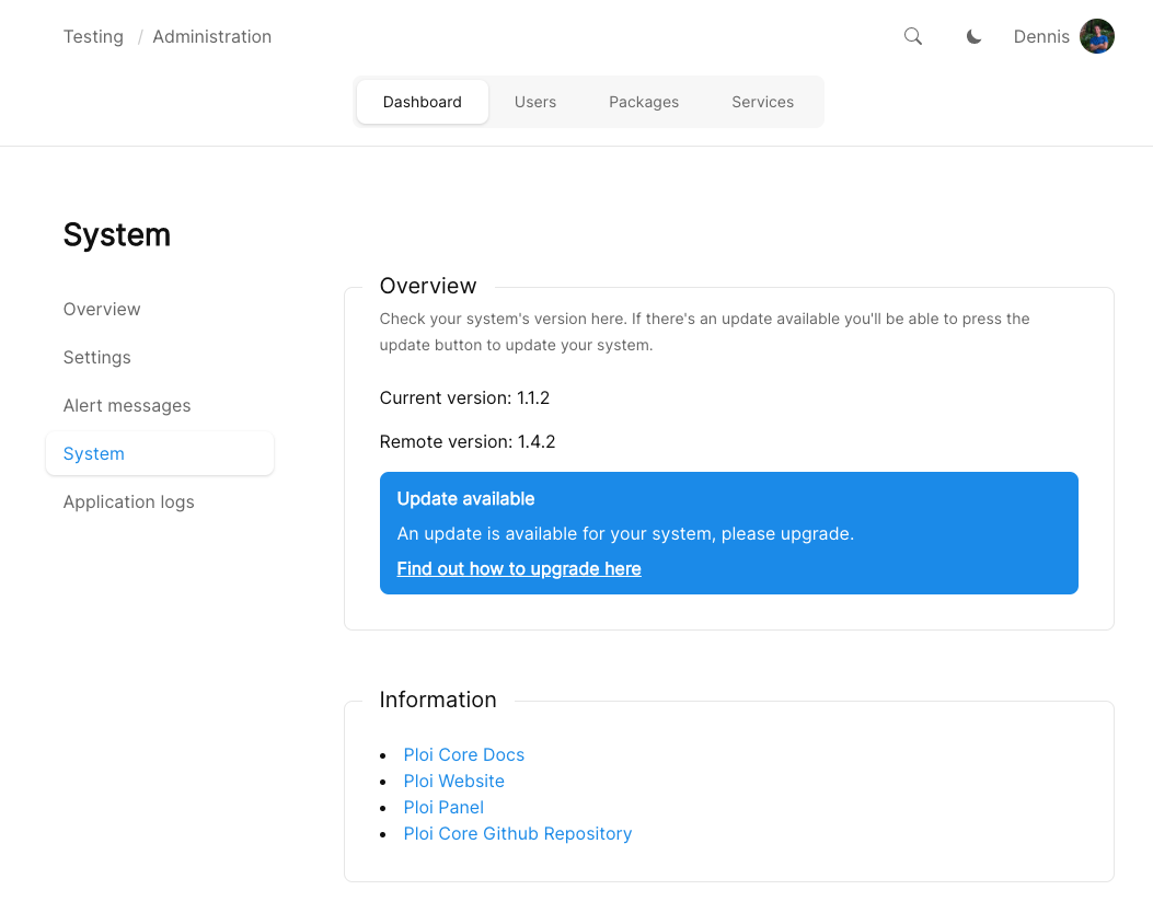 Next you will be taken to the administration dashboard. At the left, press "System" which will take you to the overview of versions for your installation.